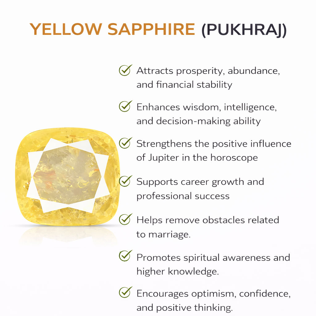 Yellow Sapphire is considered the primary gemstone of Jupiter (Guru), the planet representing knowledge, expansion, fortune, and divine blessings. When properly recommended and worn, this gemstone is believed to enhance positivity, attract abundance, and strengthen the influence of Jupiter in one’s life.